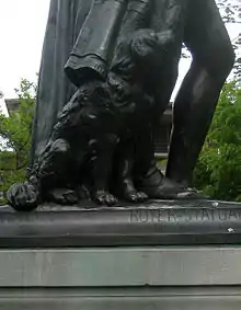 "...with his proper right hand raised to his chest, pointing with his index finger. He holds an open scroll with his proper left hand. A small dog sits at his feet on his proper right. William the Silent wears the clothes of a civilian magistrate of the 16th century. He has a moustache and a beard, and he wears a ruffled collar, an open ankle-length coat, a buttoned vest, and bloomers. The sculpture is mounted on a square base."[3]