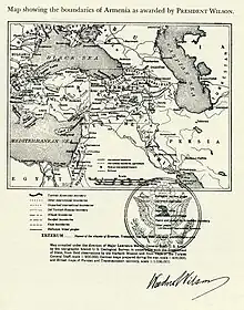 Wilsonian Armenia (Armenian: Վիլսոնյան Հայաստան) was the unimplemented boundary configuration of the First Republic of Armenia in the Treaty of Sèvres, as drawn by U.S. President Woodrow Wilson's Department of State.[1]: 40–44 The Treaty of Sèvres was a peace treaty that had been drafted and signed between the Western Allied Powers and the defeated government of the Ottoman Empire in August 1920, but it was never ratified and was subsequently superseded by the Treaty of Lausanne. The proposed boundaries of Wilsonian Armenia incorporated portions of the Ottoman vilayets of Erzurum, Bitlis, Van, and Trabzon, which had Armenian populations of varying sizes. The inclusion of portions of Trabzon Vilayet was intended to provide the First Republic of Armenia with an outlet to the Black Sea at the port of Trabzon. A proposed Republic of Pontus was discussed at the Paris Peace Conference of 1919, but the Greek government of Eleftherios Venizelos feared the precarious position of such a state, so a portion of it was instead included in the proposed state of Wilsonian Armenia.