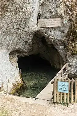 The Wimsener Höhle is located in limestone rocks of the Weißjura Formation, which were deposited in the Jurassic ocean some 150 million years ago. The Wimsen cave is estimated to be about one million years old and was created as is typical for a solutional cave by the spring water of the Zwiefalter Aach, which when rainwater absorbed carbonic acid, seeped through the soil layers in the catchment area and penetrated deeply into the white jura.[1]