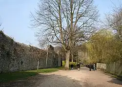 Winchester city walls are a series of defensive walls in central Winchester, originally built during the Roman settlement of southern Britain, in what was then the settlement of Venta Belgarum. The area surrounding Winchester had been populated throughout the Iron Age, with Britonnic settlements existing at Oram's Arbour, St Catherine's Hill, and Worthy Down; Venta Belgarum took its name from the Belgae tribes of the area. Earthwork defences were constructed around the end of the second century, being rebuilt in stone during the latter part of the third century..[1][2]