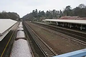 As with Hook and Farnborough Main, there is a wide gap between the platforms and their tracks. Originally an island platform stood in between them, but these have been removed. When the station was expanded so this platform could be built, one of the platforms was removed and rebuilt further away. Consequently, the current platforms have different style canopies.