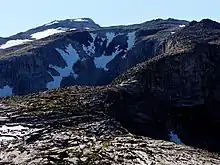 Wind River Peak (13,197 feet (4,022 m)) is the highest point in the southern end of the Wind River Range that is located in the U.S. state of Wyoming. The peak straddles the Continental Divide and is surrounded by National Forest lands.[3] The west slopes are in the Bridger Wilderness of Bridger-Teton National Forest, while the east side is in the Popo Agie Wilderness of Shoshone National Forest. In a cirque on the northeast slopes of the peak lies Wind River Glacier.[3]