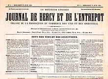 On August 9, 1905, parliament passed a law which required large wine merchants in Paris to have a storefront at the Bercy warehouse and its wine market.[8] Until the beginning of the 20th century, the two Parisian warehouses (the other being the Saint-Bernard market on the left bank) were of about equal importance. But the specialization of the Saint-Bernard market in fine wines and alcohol and the expansion of Bercy in 1910 gave the advantage to the latter. In 1930, Bercy represented 70% of storage and exits compared to 30% for the Saint-Bernard market.[7]