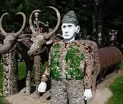 The Wisconsin Concrete Park is a sculpture park located along Wisconsin Highway 13 in the town of Phillips, Wisconsin. The park includes over 200 folk art sculptures built with concrete and decorated with glass bottles and other found objects. Fred Smith, who ran the Rock Garden Tavern on the property, began building the sculptures in 1948 after retiring from his career as a lumberjack. Smith, who lacked any formal artistic education, initially built two-dimensional bas relief plaques and eventually transitioned to constructing his larger sculptures. Smith continued building sculptures until 1964, when a stroke forced him to stop working.[2] Smith claimed that the sculptures "came to [him] naturally" and that "nobody knows why I made these sculptures, even me."[3]