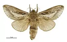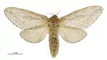 The wingspan is 44–64 mm for males and 58–75 mm for females. The forewings have white scales. The hindwings are yellow fawn or pinkish fawn with a narrow, distinct dark marginal line. Adults are on wing from October to May.[2]
