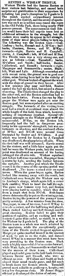 Report of Wishaw Thistle 3–2 Renton, 26 January 1889, from the 2 February 1889 edition of the Wishaw Press