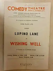 Wishing Well is a comedy play by the British writer Eynon Evans. It was first staged at the Grand Theatre, Wolverhampton in 1946. It ran for 44 performances at the Comedy Theatre between 4 September and 11 October 1952. The West End cast included Evans, Lupino Lane, Glyn Houston, Douglas Argent and Patsy Smart. The owner of the Wishing Well inn tries to solve various people's problems.[1]