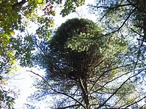 Witch's broom or witches' broom is a deformity in a woody plant, typically a tree, where the natural structure of the plant is changed. A dense mass of shoots grows from a single point, with the resulting structure resembling a broom or a bird's nest. It is sometimes caused by pathogens.