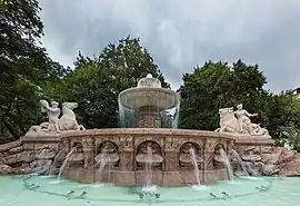 The Wittelsbacher fountain is a neoclassical monument located in Maximiliansplatz in the center of Munich, Bavaria, Germany. It was created between 1893 and 1895, with design by sculptor Adolf von Hildebrand and with the help of sculptor Erwin Kurz. His subject is an allegory on the primal forces of the element water. With its calm and clear design, and also from the urban point of view, the fountain is considered an accomplished artistic installation of the Bavarian capital.