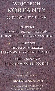 A plaque dedicated by the University of Wrocław to celebrate the 130th anniversary of Korfanty's birth in 2003. The text reads: Student of philosophy, law, and economics at Wrocław University; journalist, defender of Polishness, leader of the Silesian Uprisings; member of parliament and senator of the Polish Republic.
