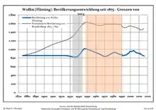Development of population since 1875 within the current Boundaries (Blue Line: Population; Dotted Line: Comparison to Population development in Brandenburg state; Grey Background: Time of Nazi Germany; Red Background: Time of communist East Germany)