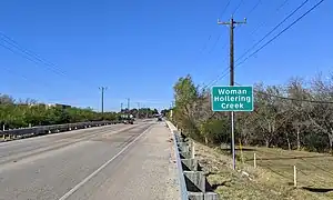 Woman Hollering Creek is a creek located in Central Texas. At one point, it crosses Interstate 10, between Seguin, Texas, and San Antonio, Texas. It is a tributary of Martinez Creek, which is a tributary of Cibolo Creek, a tributary of the San Antonio River.