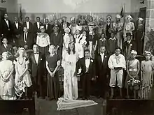 A womanless wedding is a traditional community "ritual of inversion" performance, popular in the United States in the early 20th century.[1][2] In this comic ritual, the all male cast would act out all roles of a traditional wedding party – including those of bridesmaids, flower girls, and the mother of the bride – while dressed in gowns and dresses.[3] The event often raised money for charities, civic organizations, and churches.[1]