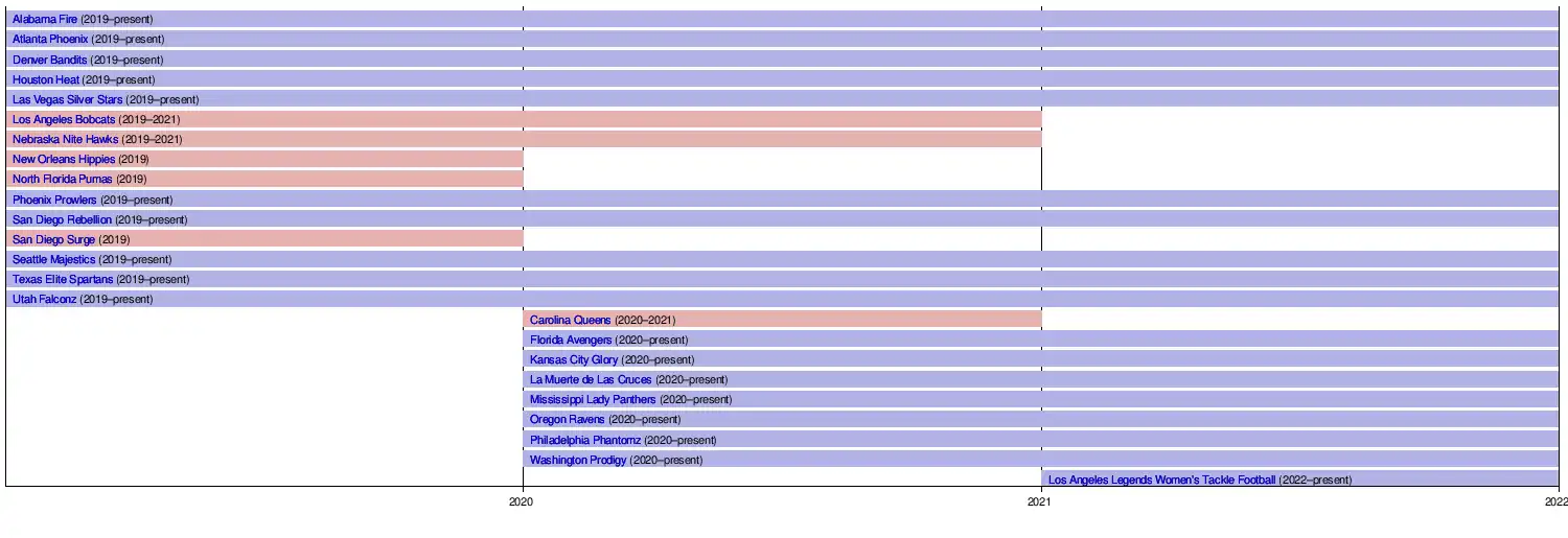 The WNFC played their inaugural season in 2019 with fourteen regular teams and one exhibition team. Five teams came to the WNFC from the Independent Women's Football League (which folded after the 2018 season), three from the WFA, two from the USWFL and five were brand-new teams playing their inaugural season in the WNFC.