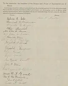 Anti-suffragists in Maine corresponded with the Massachusetts Association Opposed to the Further Extension of Suffrage to Women (MAOFESW).[87] Many upper-class women from the Portland area were interested in opposing women's suffrage.[88] Maine anti-suffragists first sent petitions or "remonstrances" against women's suffrage to the Maine Legislature in 1887.[89] The next round of petitions in 1889 had even more signatures.[89]