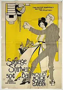 In July 1916, more than 800 women rallied at the home of Alice Kiernan to celebrate the dedication of a Pennsylvania suffrage flag and the inclusion of women's suffrage in political party planks.[60][61] Winifred Barron Meek Morris organized the Shirtwaist Ball in 1916 to raise money for women's suffrage.[55] The ball was held at Motor Square Garden and around 3,000 people of all social classes attended the ball.[62][55]