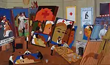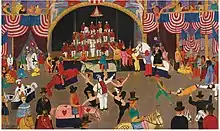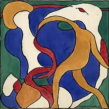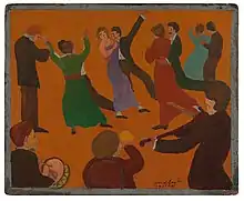 Gaylor had two paintings accepted for exhibition at the 1913 Armory Show which Kuhn had helped to organize.[10] Both were said to be impressionist in style.[6] In 1915, he painted an abstract work (shown at right) and became a member of the short-lived Cooperative Mural Workshop run by Katherine Dreier and her sister Dorothea. When he participated in a group exhibition held by the group that year (and possibly showed that painting), a critic described the works on view as "brilliant and vivid" in color and "simple and direct" in design.[11] The next year, in February, the Thumb Box Gallery gave him a solo exhibition and he participated in a group exhibition at the Montross Galleries.[12][13] Calling the solo exhibition "exceedingly interesting", a critic for American Art News said the carved and painted wood panels he showed were "exceptionally good in color and design" and noted that Gaylor "utilizes humans for designs in an amazing way".[14] In reviewing the group show, a critic described the painting called "Dawn" that Gaylor contributed as "well designed, but with terra cotta colored and non-modeled figures of a father and mother whose child is darker than they are."[13] The painting, "Social Dance" of 1915-16 (shown at right) may have been included in this exhibit. In October 1916, he showed works in a group exhibition at Montross Galleries organized by the New York Society of Etchers.[15] In 1917, Gaylor joined Kuhn and others in a short-lived group called the Penguin Club which, like the Armory Show, aimed to provide support for artists who rejected the conservative aesthetics of the National Academy.[2] In March of that year, he participated in one of the first exhibitions held by the club.[16] A critic described the drypoints, aquatints, and etchings that he showed as "interesting" with disconcerting color effects. The critic also said Gaylor's carved wood panels showed good drawing and striking coloring.[17]