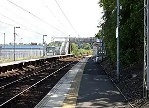 ![]() Woodhall station, looking east towards Glasgow Central. The footbridge can be seen in the background. | |