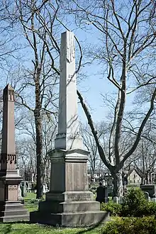 The burying ground has a "profusion of well-designed monuments",[185] including many notable funerary works in the Egyptian Revival, Neoclassical, Richardsonian Romanesque, and Victorian architectural styles.[183][184] Individual memorials noted for their beauty over the years include those of William R. Henry (Section 1),[17][lower-alpha 19] Hiram Iddings (Section 6),[187] Hannah Miles (Section 27),[187] and Adolph G. Rettberg (Section 3).[187] Notable family plots and memorials include the Brainard and Burridge vault (Section 3),[187] the Eells family monument (Section 13),[187] and the Sprankle crypt.[188][lower-alpha 20] Other notable memorials include the Mary Keokee Monroe grave (which features a marble angel in a glass enclosure beneath a granite temple; Section 35),[165] and a memorial in Section 26 designed to look like a giant open book.[189]