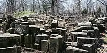 By the beginning of January 1852, the city had hired landscape architect H. H. Blackmore to survey the cemetery grounds.[6] Design work appeared to be complete by the end of February, at which time Blackmore was paid $40 ($1,407 in 2022 dollars) for his work.[7] The city council approved the sale of timber from the land in April in order to finance improvements,[1] and by July work on grading roads and pathways, platting, and landscaping were well under way.[8] A second landscape architect, Howard Daniels, was hired in October 1852 to complete the design of the cemetery. Paid $22 a day ($774 in 2022 dollars), Daniels employed a civil engineer, two drafters, and an assistant while working on the property.[1] Daniels designed Woodland to be a rural cemetery, with winding paths, plenty of trees, and room for monumental funerary monuments.[9][10][11][lower-alpha 3]