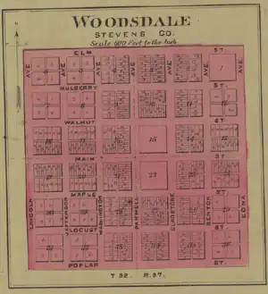 Woodsdale was laid out in 1886 near the geographical center of the county, with the hope of locating the county seat there.[2]