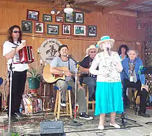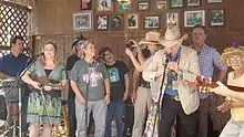 The 10th annual festival took place July 11–15, 2007. To celebrate the ten-year anniversary, one of many Oklahoma centennial-year events, the festival kicked off with a ticketed event on Wednesday night in Okemah's historic Crystal Theater.[2] Seven "10-year artists" - artists who have participated every year since the festival's inception - performed at a Coalition benefit show titled "In the Spirit of Woody Guthrie". Those artists were Jimmy LaFave, Don Conoscenti, Ellis Paul, Bob Childers, Joel Rafael, Terry "Buffalo" Ware, and the Red Dirt Rangers.[36] The 2007 lineup spanning over four days included more than 60 artists from many genres including folk, alt-country and rock. Members of the Guthrie family scheduled to appear were Arlo Guthrie and Cathy Guthrie (daughter of Arlo) and Amy Nelson (daughter of Willie Nelson), who perform as Folk Uke. More than 100 artists performed at the festival's 10-year celebration including Kevin Welch, Sara Hickman, Butch Hancock, Tim O'Brien, Ronny Elliot, Terri Hendrix and Lloyd Maines, Rob McNurlin, Jack Williams, Antje Duvekot, Johnsmith, Sam Baker, David and Adam Amram, The Burns Sisters, Ronny Cox, Michael Fracasso, Radoslav Lorković and Eliza Gilkyson.[37] The tenth festival again concluded on Sunday with a "Hoot for Huntington's", having become a Woody Fest tradition. The hootenanny is coordinated and led by Terry "Buffalo" Ware, a guitarist living in Norman, Oklahoma, and the Woody Guthrie Folk Festival All-Star House Band. The House Band also includes Randy Crouch (fiddle/pedal steel), Don Morris (bass), Dean Brown (drums), Dan Duggin (accordion) and T.Z. Wright (keyboard/accordion). The House Band can be heard playing back-up for many festival performers and in 2007 also played a set of their own - as The Oklahoma Geniuses - at the Brick Street Cafe.[38]