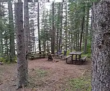 Woody River Recreation Site (52°28′45″N 101°42′03″W / 52.4791°N 101.7009°W / 52.4791; -101.7009)[17] consists of separate parcels of land plus additional Crown land centred around several lakes, Woody River, and Midnight Creek in the Porcupine Hills. Access is from Highway 980, which connects all of the lakes and amenities in the park, and by snowmobile. When travelling by snowmobile from the town of Hudson Bay, there are two warm-up shelters along the way.[18] Accessible lakes within the East Block include Isbister, Spirit, Smallfish, Woody, Elbow, and Townsend. All six lakes have boat access and fish commonly found in the lakes include walleye, perch, and northern pike. Campsites and picnic areas exist at Spirit, Isbister, Smallfish, and Townsend Lakes.[19] A rough ATV trail begins at the Spirit Lake Campground and heads north-east past Spirit Mountain and goes to Armit Lake, which is the largest lake in the Porcupine Hills.