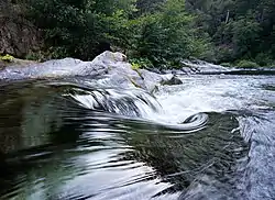 Wooley Creek is a large stream in Siskiyou County, California, a tributary of the Salmon River. Wooley Creek flows 22 miles (35 km)[1] from Man Eaten Lake[2] in the Marble Mountain Wilderness of the Klamath National Forest, in a generally southwest direction, to its confluence with the Salmon River about 4 miles (6.4 km) upstream of the Salmon's confluence with the Klamath River at Somes Bar.[3] The creek drains an isolated and rugged wilderness area – there are no paved roads and only a few permanent residents in its watershed. Lower Wooley Creek provides Class IV-V (very difficult) whitewater and is seldom run due to the lack of easy access.[4] The Wooley Creek Trail provides access along the creek into the wilderness area. It is one of the few major trails in the area suitable for year-round use due to its low elevation.[5]