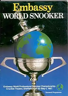 The 1987 World Snooker Championship (also referred to as the 1987 Embassy World Snooker Championship for the purpose of sponsorship) was a professional snooker tournament that took place between 18 April and 4 May 1987 at the Crucible Theatre in Sheffield, England. It was the sixth and final ranking event of the 1986–87 snooker season. The championship was the 1987 edition of the World Snooker Championship, first held in 1927, and had 32 participants. The highest ranked 16 players were awarded a place in the first round draw, whilst a pre-tournament qualification event for 104 professionals was held between 26 March and 4 April at the Preston Guild Hall for the remaining places. The tournament was sponsored by cigarette manufacturer Embassy and had a prize fund of £400,000 with the winner receiving £80,000.