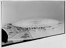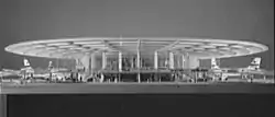 The terminal was originally known as the "Pan Am Terminal" or Pan Am "Unit Terminal Building" (UTB). It was designed by Ives, Turano & Gardner Associated Architects and Walther Prokosch of Tippets-Abbett-McCarthy-Stratton as a showcase for international jet travel and was particularly famous for its 4-acre (1.6 ha) "flying saucer" roof projecting out from the outer columns of the terminal supported on 32 sets of pre-stressed horizontal steel posts and cables. The terminal was designed to allow for aircraft to be parked under the overhanging roof; marketing brochures promoted it as the Jet Age terminal that brought the plane to the passenger. The overhang sheltered passengers as they boarded the aircraft by stairs or by uncovered bridges. The American Institute of Architects (AIA) Guide to New York City called the terminal a "genuine architectural attempt to answer the problem of all-weather connections to the planes" but derided the overall concept as "compromised by an overabundance of distracting detail".[1]