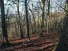 Westridge Wood (unit 1) and Conygre Wood (unit 3) are the two main areas of ancient woodland, which are mostly beech. Ash and pedunculate oak are widespread, and other trees include field maple and locally small-leaved lime. Historically the woods were managed as coppice and old stools remain present. The woodland is now high forest with an understorey, and a rich flora which is characteristic of beech woods. Ground flora includes nettle-leaved bellflower, goldenrod, spurge laurel and tutsan. stinking hellebore and wood barley (Hordelymus europaeus) may also be found. The site is one of only two United Kingdom sites for the nationally rare limestone woundwort which is found and monitored in Old London Road reserve (unit 2). It is also now reported present in Westridge Wood and Conygre Wood.[4][5]