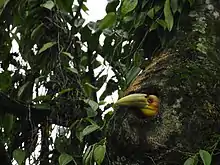 The wreathed hornbill is a monogamous breeder that demonstrates biparental care. It nests in the cavities of large trees located in coastal forests, illegally logged areas, or among foothills up to an elevation of 2,560 m (8,400 ft).[12] It searches for existing oval-shaped tree cavities for nesting because it cannot excavate its own.[27] The nest height ranges from 18 to 28 m (59 to 92 ft) above ground.[28] Females use droppings or mud to cover the nest hole to protect the clutch and fledglings from predators but leave a gap large enough for males to deliver food.[28] They unload the mud when they need to leave the nest.[28]