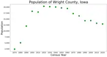 Wright County is a county in the U.S. state of Iowa. As of the 2020 census, the population was 12,943.[1] The county seat is Clarion.[2] The county organization became effective in January 1851, and is believed to be named either after Silas Wright, a governor of New York, or Joseph Albert Wright, a governor of Indiana.[3]