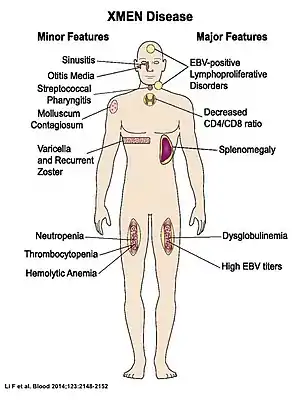 4. 1 2 3 4 5 Li FY, Chaigne-Delalande B, Su H, Uzel G, Matthews H, Lenardo MJ (April 2014). "XMEN disease: a new primary immunodeficiency affecting Mg2+ regulation of immunity against Epstein-Barr virus". Blood. 123 (14): 2148–52. doi:10.1182/blood-2013-11-538686. PMC 3975255. PMID 24550228.