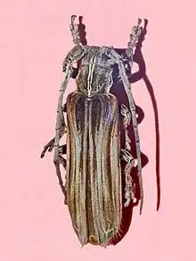 Xylorhiza adusta can reach a length of about 35–40 millimetres (1.4–1.6 in). The background color of this mimetic bark-like long-horned borer is greyish-brown, with dark brown longitudinal lines on the hairy elytra. Main host plants include Callicarpa arborea, Callicarpa macrophylla, Premna pyramidata, Viburnum odoratissimum and Wrightia tinctoria.