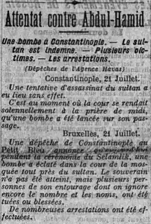 The Yıldız assassination attempt is a failed assassination bombing attempted on Sultan Abdul Hamid II by the Armenian Revolutionary Federation (ARF) at Yıldız Mosque. The bombing took place on 21 July 1905 in the Ottoman capital Istanbul.[1] The Times described the incident as "one of the greatest and most sensational political conspiracies of modern times."[1]
