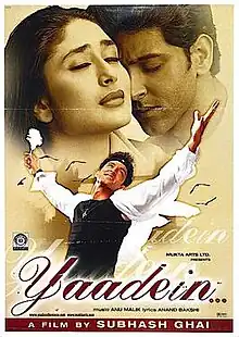 Yaadein (transl. Memories) is a 2001 Indian Hindi-language musical drama film written, directed, edited and produced by Subhash Ghai.[2] The ensemble cast cross over film starring Jackie Shroff, Hrithik Roshan, and Kareena Kapoor. The film was released worldwide on 27 July 2001 to negative reviews and was a box office disappointment.[3][4][5] Jackie Shroff received a nomination for Filmfare Award for Best Supporting Actor at the 47th Filmfare Awards.[6] Despite its box office failure, the film was profitable due to ancillary revenues of ₹21 crore, including ₹8.2 crore from selling music rights to Tips.[7]