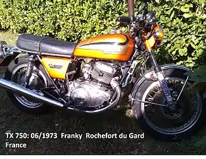 The TX750 is a two-cylinder standard motorcycle built by Yamaha. The bike was released in 1972. Significant reliability problems affected the engines in early bikes. Yamaha made several changes to solve the problems but the bike was withdrawn from most markets after 1974 and production stopped in the home market after 1975.