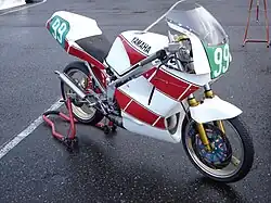 Yamaha produced the road going two-stroke motorcycle, loosely based on the TZ250 Yamaha racing bike. Parallel-twin, reverse cylinder and finally 90° V-twin variants were produced. It evolved as a natural replacement for the popular RD 250/Yamaha RD350LC series of the 1980s. It has the Yamaha Power Valve System 'YPVS' which raises and lowers the exhaust port depending on the rpm of the engine. The YPVS servo motor starts to open at about 6,000rpm. In standard form it produced 45 hp due to the restrictive standard exhausts and ignition boxes.[2]