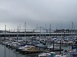 In 2015, Pacific Whiting, or North Pacific Hake, was the largest source of fish caught by commercial fisheries from Newport, OR, while Pink Shrimp brought in the greatest dollar amount. As of 2015, the total value of commercial fisheries out of Newport totals approximately $33,221,009.[8] Recreational fishing also occurs in Yaquina Bay, with perch, rockfish, herring, chinook salmon, clams, and crabs the popular catch.[9] Aquaculture of oysters also occurs in Yaquina Bay, totaling 1,172 pounds in 2012.[10]