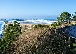 Erosion is a challenge for Yaquina Bay and the entire Oregon Coast. Yaquina Bay's sediments are made up of sandstone, siltstone and clay-containing mudstone and these soft sediments contribute to annual erosion.[20] Waves, however, are the main proponent of erosion. Waves are parallel to the beach and as wind increases, energy is enhanced and height grows, causing a devastating effect on beaches.[43] Also, as currents run along the coast, they move sand causing either addition or depletion of sand in some areas. This has been evident around the Yaquina Jetty. With longshore drift increased during the winter, sand is deposited and dramatically built up in this area.