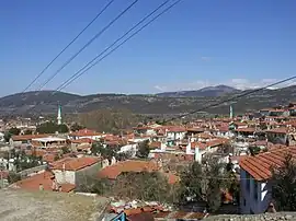 It is accessed by a turnout at a short distance from Muğla-İzmir highway just before entering Muğla. The town is located along slopes in the southern end of a plain of the same name.