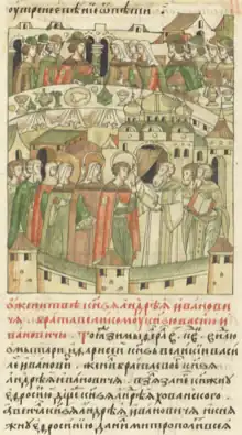 ![]() Marriage of Andrey of Staritsa to Yefrosinya Khovanskaya, miniature from the Illustrated Chronicle of Ivan the Terrible | |