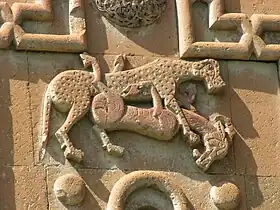 Exceptionally rich decorations cover a large portion of the church. There are beautiful motifs on each side at the second floor level and geometric patterns around the cornices, eaves, and other parts of the walls. Notable is the large cross carved in high relief on the front flanked by the Virgin Mary holding the baby Jesus and another saint. Below and just above the portal to the second floor are the motifs of a bull and lion. Above the larger window on the right façade is a motif of a large bird with a geometric rosette on its chest holding a hooved animal in its talons. On the left façade is a mountain goat, and on the rear is a large cat pouncing upon a goat.