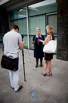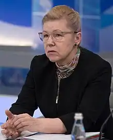 Yelena Mizulina is the author of several legislative projects directed against "propaganda of homosexuality" including the infamous Russian LGBT propaganda law.[74] She believes that the phrase "gays are people too" should be considered potentially extremist by the Federal Service for Supervision of Consumer Rights Protection and Human Welfare.[75] Yelena Mizulina is also in favor of confiscating children from gay parents, including biological parents.[76][77][78][79]