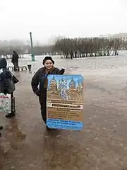 Osipova is known for participation in virtually all protest rallies with placards denouncing injustice and crime, warning of danger, and sympathizing with someone's distress, be it natural disasters or violations of political freedoms.[11] She tried to attract public attention to Beslan school siege, Iraq War, November 2015 Paris attacks, Bolotnaya Square case, Annexation of Crimea by the Russian Federation, War in Donbas. She honoured memory of Boris Nemtsov.[10][14] For some time, she was detained at every rally, but then brought home by the police officers.[4][16] For her active civic stance, the artist has come to be referred to as "The Conscience of St. Petersburg".[10][16]