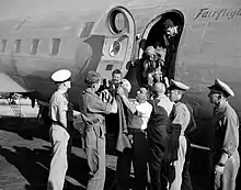 Jewish Agency representatives meeting Yemenite immigrants, upon arrival at Lod airport in 1949