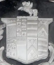 • Sir Edward Cary (died 1654) of Dungarvon, Ireland, and of Bradford, Devon (elder nephew). He was knighted in Ireland in 1625 by his cousin Henry Cary, 1st Viscount Falkland.[27] He died in 1654 and was buried in Marldon Church, South Devon. "In the east window of the south aisle are some remains of old glass, bearing the arms of the Cary family. In the chancel are several old tombstones, one, with an inscription in memory of Edward Cary, bears the date 1654" (Stabb).[28] He married Margaret Blackhurst of Lancashire, whose monument survives in Marldon Church.[27]