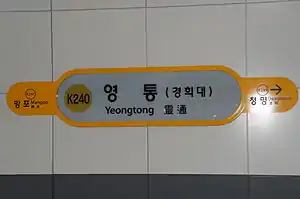 Yeongtong Station is a subway station of the Suin–Bundang Line, the commuter subway line of Korail, the national railway of South Korea.