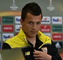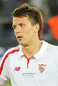 On 11 August, he made his competitive debut for Sevilla in the 2015 UEFA Super Cup against Barcelona, as a 68th-minute substitute for captain José Antonio Reyes. He scored an 81st-minute equaliser as Sevilla came from behind to draw 4–4, but they lost 5–4 after extra time.[13] Ten days later, he made his La Liga debut in a goalless draw at Málaga, again as a 65th-minute substitute for Reyes, and on 16 September, he scored on his UEFA Champions League debut, concluding a 3–0 group stage win over Borussia Mönchengladbach at the Estadio Ramon Sánchez Pizjuán with his first touch of the game.[14] Ten days later, after coming off the bench against Rayo Vallecano, he attained his first league goal for the Andalusians, winning the match 3–2 with a late free kick for a first victory of the season.[15]